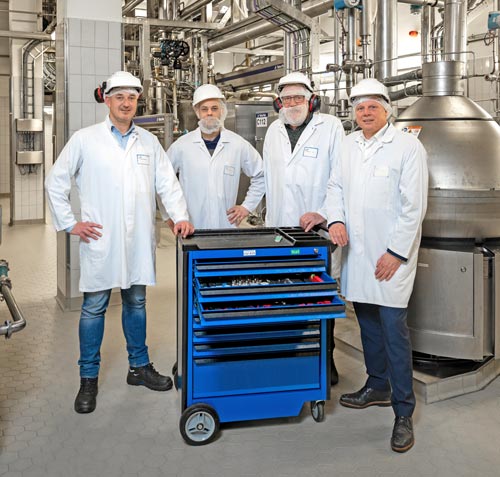 Between those man-sized centrifuges is a blue tool cart. A beautiful, sleek cart with eight drawers and castors. The cart contains all the tools the mechanics need for maintenance. General operator Kevin Emons and WCOM quality manager Harrie van Herpen look at it with satisfaction. The carts are the outcome of such a WCOM project. And they are literally a godsend too, the two say. "The mechanics always have the right tools with them. As a result, they work better and faster and we have less downtime in our production process."